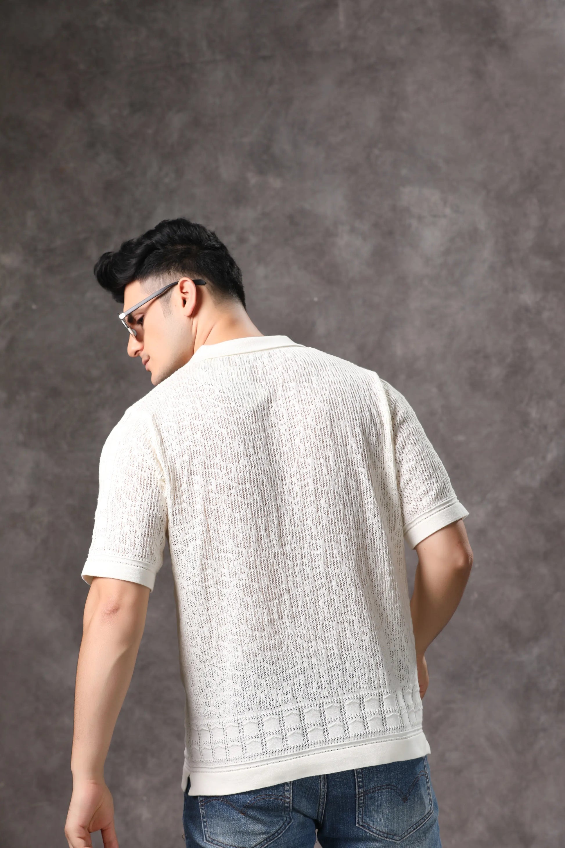 Elevate your warm-weather wardrobe with the Men's Off White Flat Knit Half Sleeve Shirt. This premium top is expertly crafted from a high-quality flat knit fabric, which is intricately woven into a breathable open-knit structure. This unique texture makes it a standout piece for summer and resort wear.